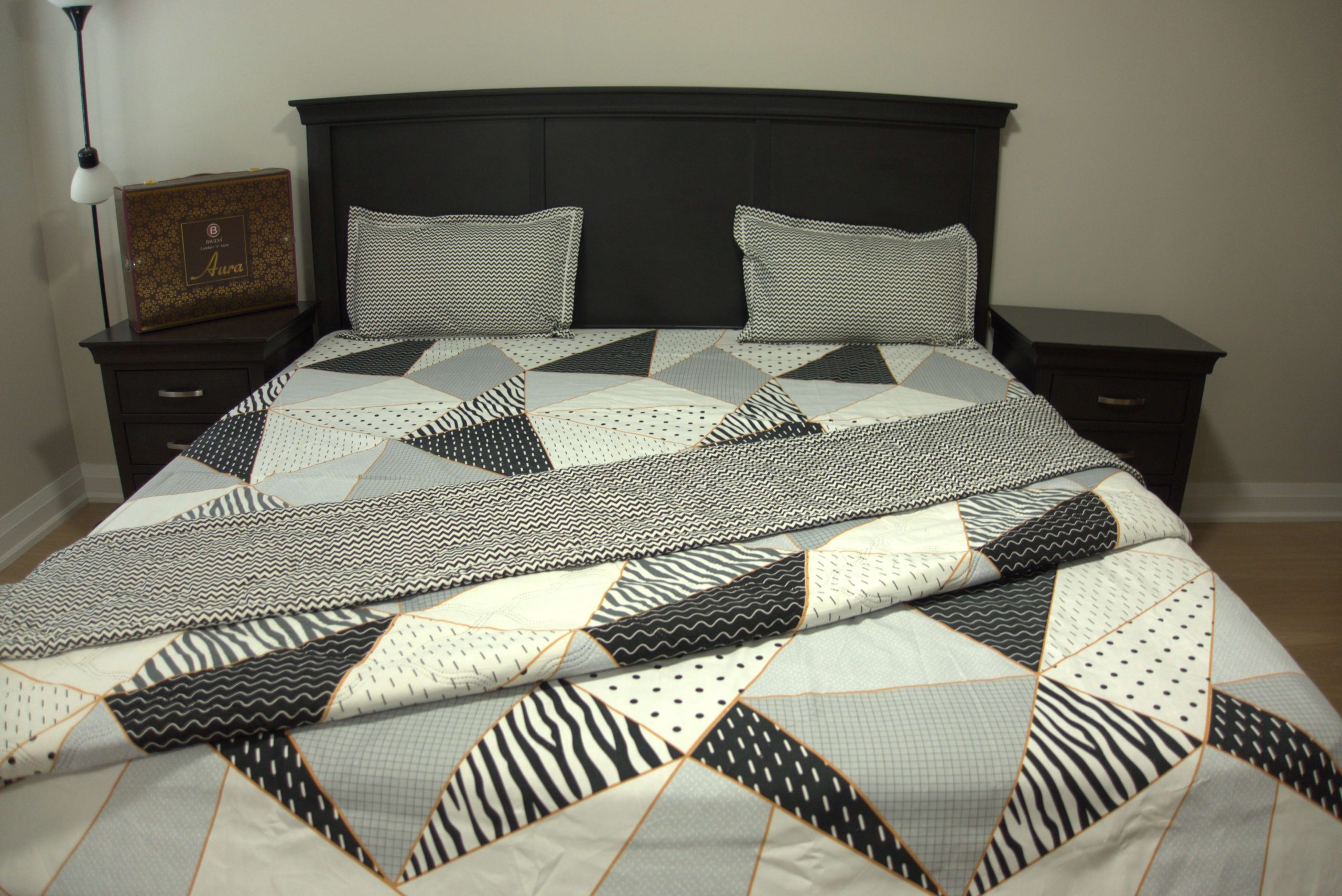 Stylish Design: The set features a unique mix of geometric and abstract patterns in a sophisticated color palette of off-white, black, and various shades of grey, accented with delicate lines. This elegant design enhances the grace of your bedroom decor.