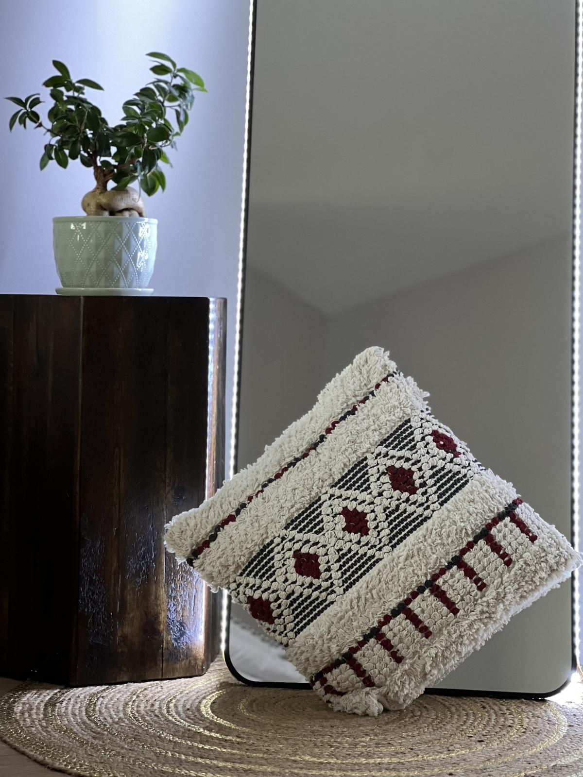 – **Elegant Design:** The red and creamy cushion has detailed chicken thread embroidery, giving it a stylish touch.